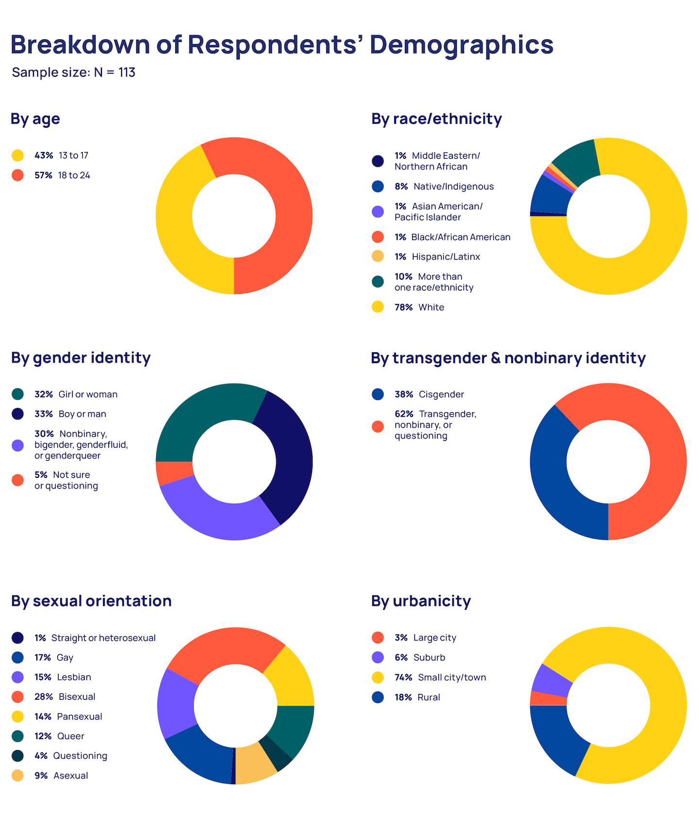A quantitative cross-sectional design was used to collect data through an online survey platform between September 13 and December 16, 2023. A sample of individuals ages 13 to 24 who resided in the United States, including its territories, was recruited via targeted ads on social media. No recruitment was conducted via The Trevor Project’s website or social media channels. Respondents were defined as being LGBTQ+ if they identified with a sexual orientation other than straight/heterosexual, a gender identity other than cisgender, or both. In order to ensure a diverse sample, targeted recruitment was conducted to ensure adequate sample sizes with respect to geography, gender identity, and race/ethnicity. Qualified respondents completed a secure online questionnaire that included a maximum of 134 questions. The questionnaire was offered in English and Spanish. Questions on considering and attempting suicide in the past year were taken from the Centers for Disease Control and Prevention’s Youth Risk Behavior Survey to allow for comparisons to their nationally representative sample. Some donut charts may not add up to 100% due to rounding.
